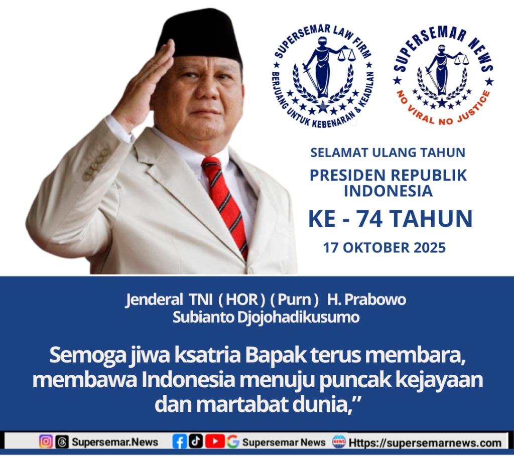 “Atas nama keluarga besar Supersemar Law Firm dan News, kami mengucapkan selamat ulang tahun kepada Bapak Presiden Jenderal TNI (HOR) (Purn.) H. Prabowo Subianto Djojohadikusumo.