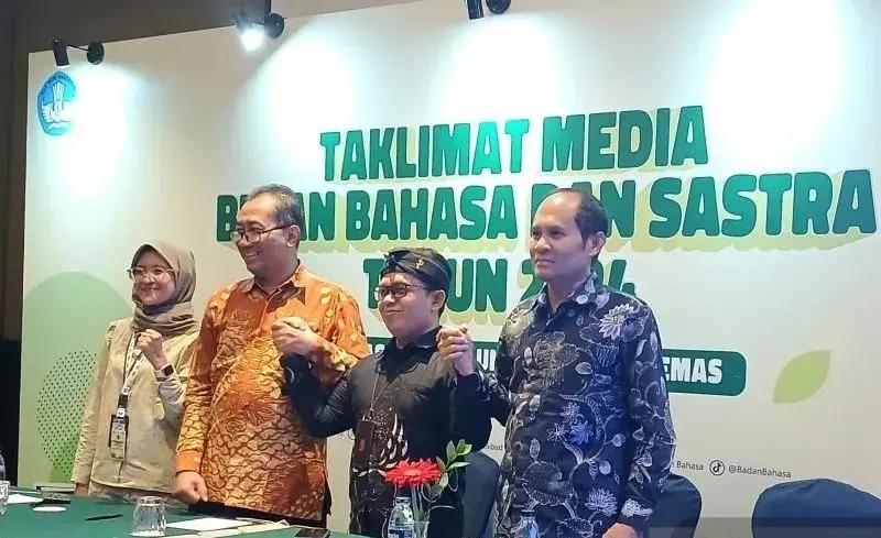 Imam Budi Utomo (kedua dari kiri), direktur Pusat Pengembangan dan Perlindungan Bahasa dan Sastra, Kementerian Pendidikan Dasar dan Menengah, menghadiri acara jumpa media untuk Bulan Bahasa dan Sastra 2024 di Jakarta pada hari Sabtu, 26 Oktober 2024.