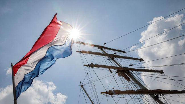 Bendera Belanda berkibar di langit terbuka, mencerminkan komitmen negara itu dalam mengembalikan artefak kolonial seperti Perunggu Benin ke Nigeria.