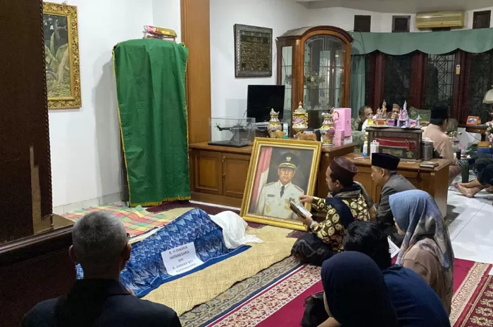 Sejumlah pelayat berkumpul di rumah duka Jalan Bangbarung Raya, Bogor Utara, mendoakan jenazah Iswara Natanegara, mantan Wali Kota Bogor, yang wafat pada Minggu, 6 Juli 2025. Terlihat potret resmi almarhum dalam balutan seragam Wali Kota turut disandingkan di sisi jenazah, menandai penghormatan terakhir untuk sosok administrator telaten tersebut.