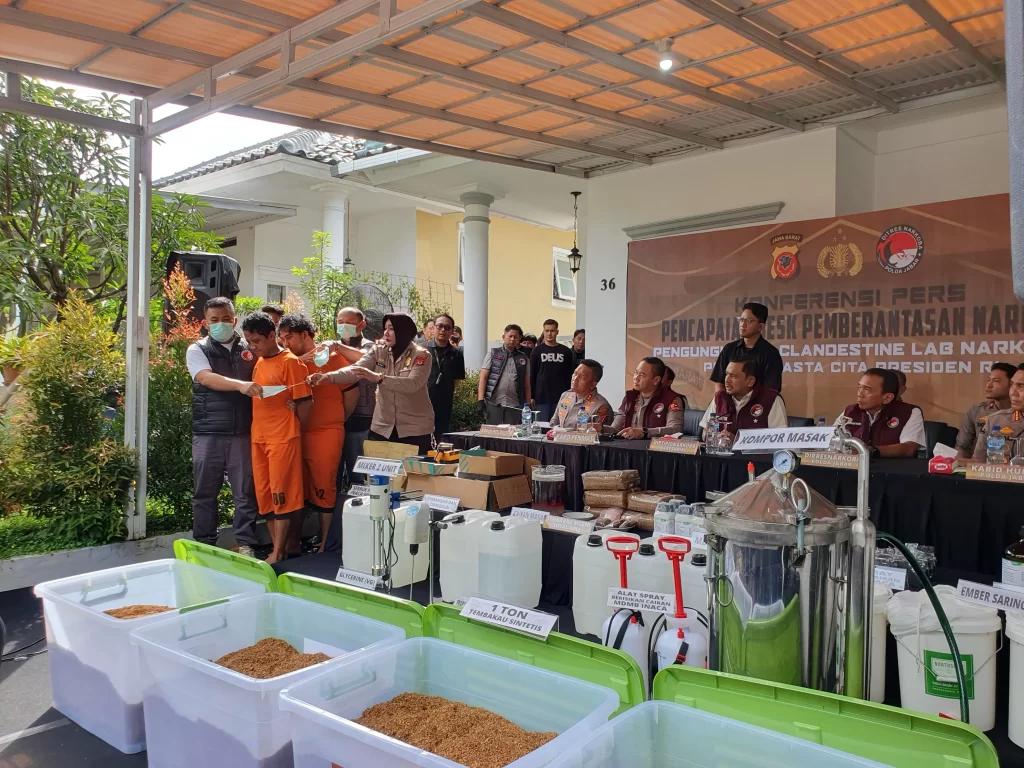 Polres Bogor berhasil membongkar pabrik narkoba terbesar di Jawa Barat dengan barang bukti 1 ton tembakau sintetis. Dalam konferensi pers, para pelaku ditunjukkan bersama alat produksi seperti kompor masak, alat spray, dan bahan baku tembakau sintetis.