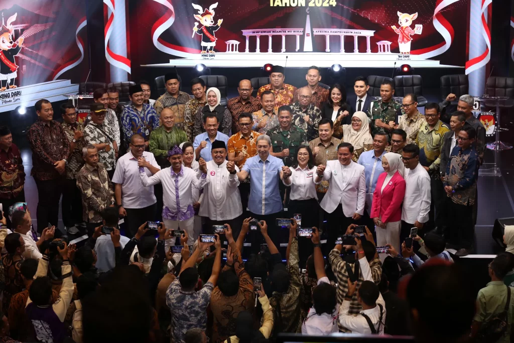 Foto bersama para Paslon,Mereka berfoto bersama dengan penuh semangat, menunjukkan kebersamaan dengan latar belakang panggung bertuliskan “Pemilihan Kepala Daerah 2024”.