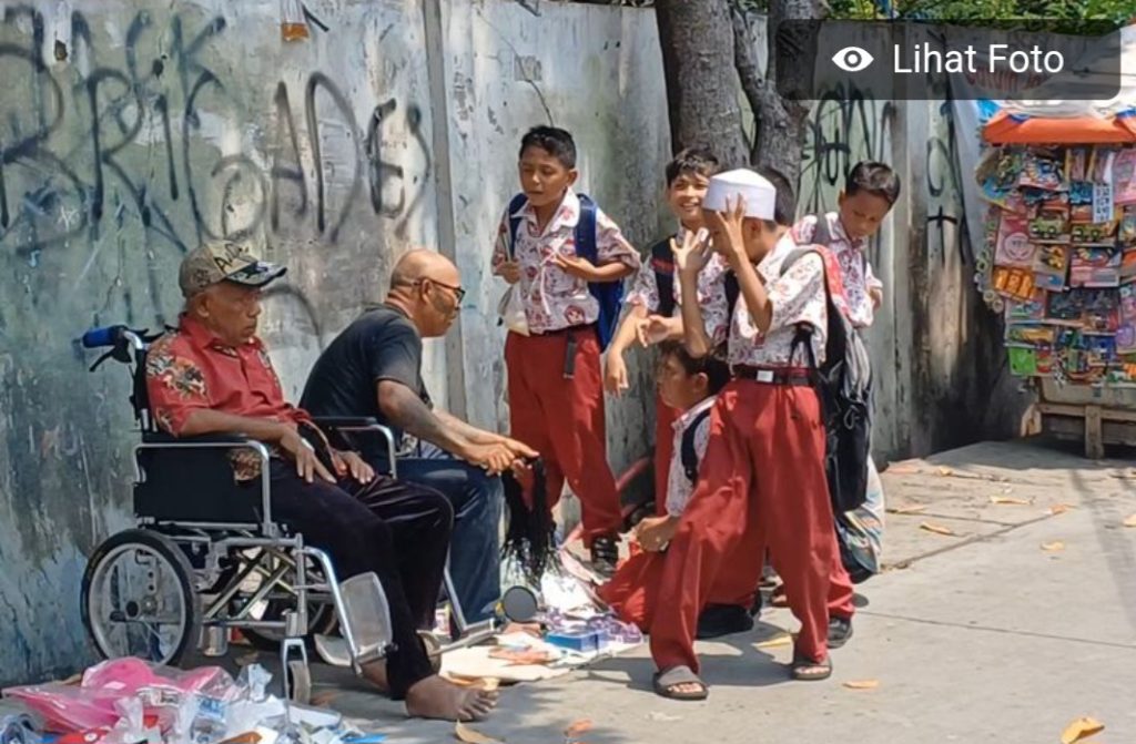 Terlihat beberapa kali mengantuk, Pak Tarno duduk di atas kursi roda sembari menunggu para siswa ke luar dari sekolah untuk membeli dagangannya.