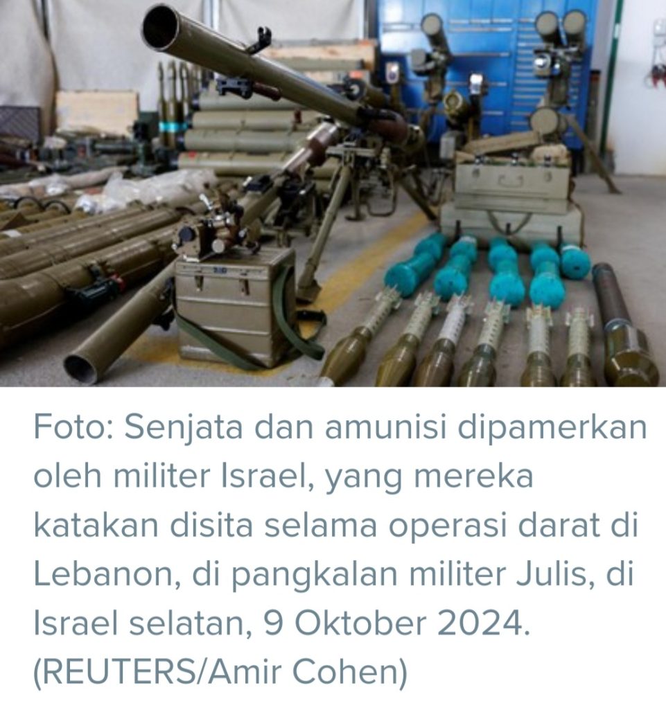 Senjata dan amunisi dipamerkan oleh militer Israel, yang mereka katakan disita selama operasi darat di Lebanon, di pangkalan militer Julis, di Israel selatan, 9 Oktober 2024.