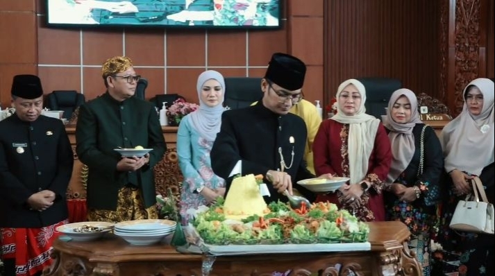 Wali Kota Depok memotong tumpeng dalam Rapat Paripurna Istimewa HUT ke-26 Kota Depok, sebagai simbol rasa syukur atas capaian pembangunan dan peluncuran program baru untuk masyarakat.(foto tangkpan layar youtube pemkot Depok)