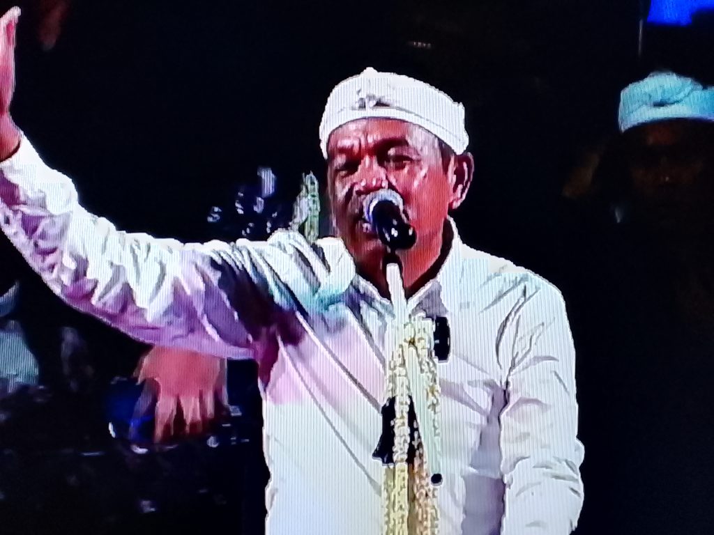Gubernur Jawa Barat H. Dedi Mulyadi dengan semangat mengangkat tangan saat membawakan sambutan di panggung HUT ke-26 Kota Depok, mengenakan pakaian adat Sunda dan diiringi tembang Wangsit Siliwangi.
