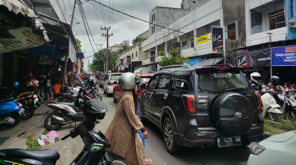 Kepadatan ini terjadi seiring meningkatnya aktivitas warga yang berbelanja kebutuhan Hari Raya Idulfitri.
