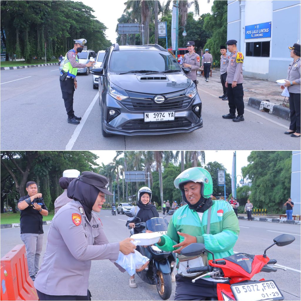 Kapolres Bekasi dan jajaran membagikan takjil di Traffic Light Jurong sebagai bentuk kepedulian dan kebersamaan di bulan suci Ramadan.