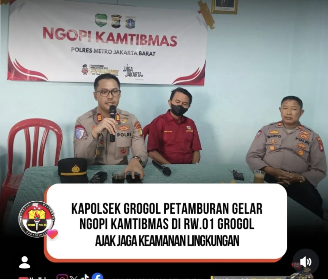 SupersemarNews, Jakarta — Kapolsek Grogol Petamburan menggelar kegiatan “Ngopi Kamtibmas” bersama warga di Sekretariat RW 01, Kelurahan Grogol, Jakarta Barat, sebagai upaya memperkuat sinergi dalam menjaga keamanan dan ketertiban masyarakat.
