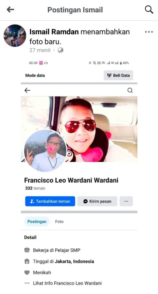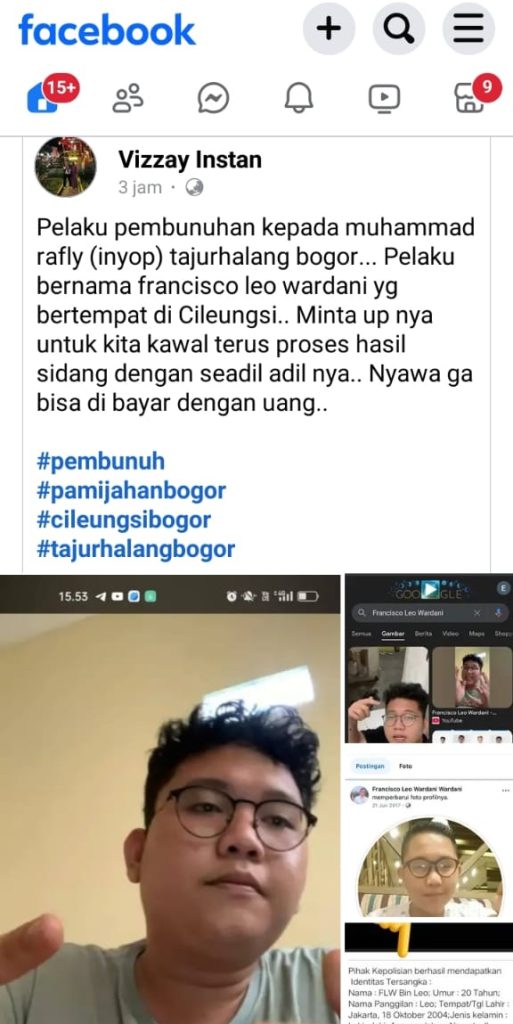 Unggahan media sosial menyebutkan pelaku pembunuhan Muhammad Rafli (Inyop) adalah Francisco Leo Wardani, warga Cipenjo, Cileungsi, Bogor.