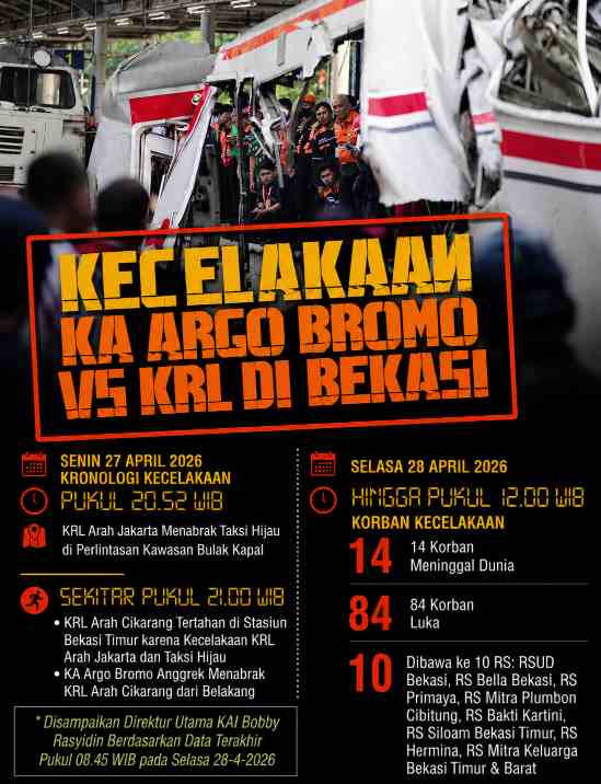 Jumlah korban meninggal dunia dalam tragedi kecelakaan Kereta Rel Listrik (KRL) di wilayah Bekasi Timur terus bertambah. Setelah sebelumnya tercatat 15 korban jiwa, kini angka tersebut meningkat menjadi 16 orang per Rabu (29/4/2026).