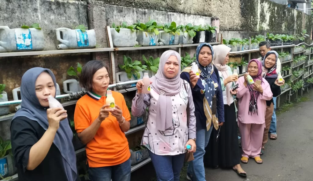 Ibu-ibu menikmati minuman lokal di depan kebun hidroponik, menunjukkan kolaborasi pertanian perkotaan dan produk sehat.