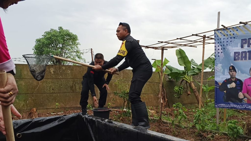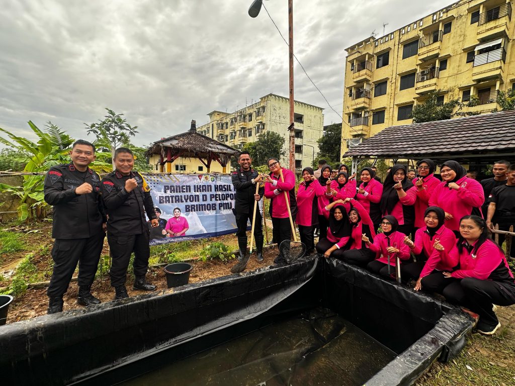 Personel Batalyon D Pelopor aktif dalam kegiatan panen ikan sebagai bagian dari program ketahanan pangan di lingkungan mereka.