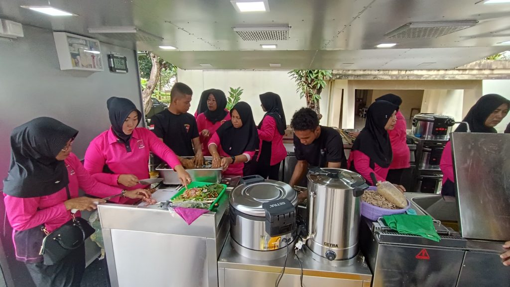 Para anggota dan ibu-ibu Bhayangkari dengan penuh semangat mempersiapkan hidangan di dapur umum dalam kegiatan sosial yang digelar oleh Batalyon D Pelopor.