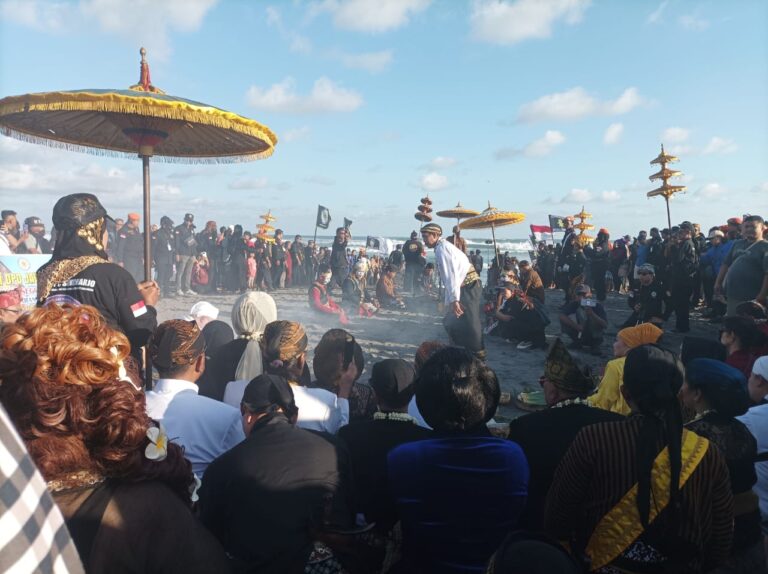 Suasana khidmat prosesi Labuhan Segoro Kidul di Pantai Parangkusumo, Yogyakarta, tampak dipenuhi peserta berpakaian adat saat ritual dipimpin oleh juru kunci Laut Selatan. (Foto: Dok. FKPPAI DPD Jawa Tengah)