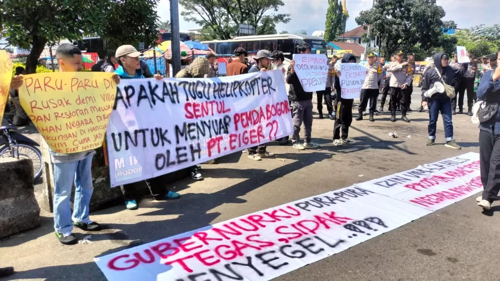 Mahasiswa membawa spanduk bertuliskan tuntutan pembekuan izin perusahaan di kawasan Puncak Bogor serta kritik keras terhadap pembangunan tugu helikopter Sentul yang diduga didanai oleh PT Eiger, dalam aksi unjuk rasa di Simpang Ciawi.