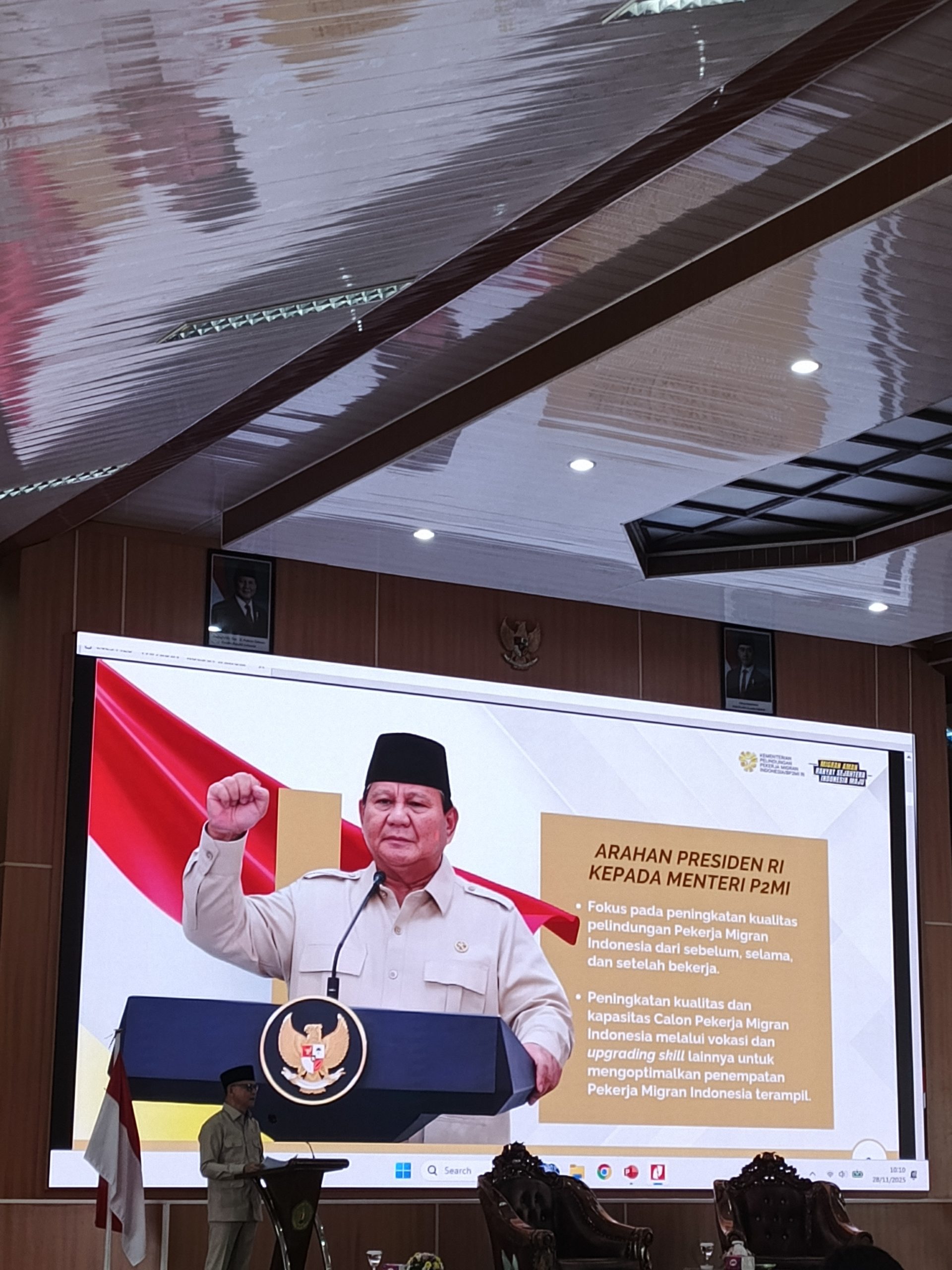 Dalam penyampaiannya, Menteri P2MI memaparkan transformasi kelembagaan perlindungan pekerja migran yang diperkuat melalui UU No. 18 Tahun 2017 Pasal 39 Huruf A, yang menegaskan peran pemerintah pusat dalam memberikan perlindungan bagi Calon Pekerja Migran Indonesia (CPMI) dan keluarga. Penguatan regulasi tersebut kemudian dilanjutkan melalui Perpres No. 139 Tahun 2024 sebagai bentuk komitmen negara dalam memperkokoh tata kelola migrasi tenaga kerja secara profesional dan terpusat.