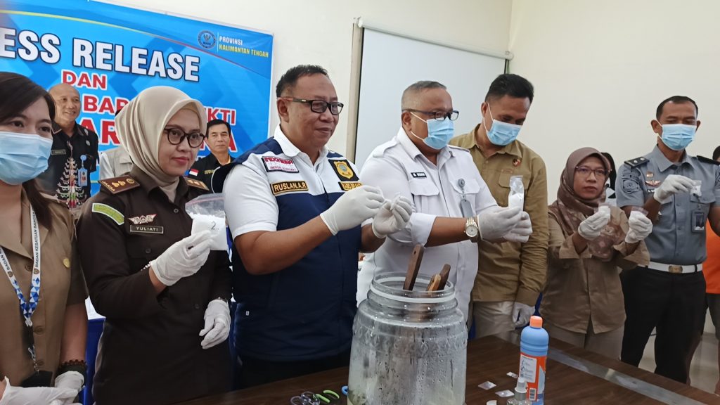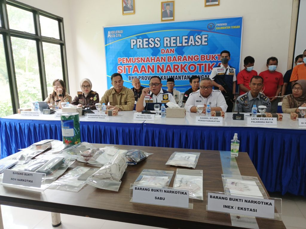Konferensi pers pemusnahan barang bukti narkotika yang digelar BNNP Kalimantan Tengah, turut dihadiri perwakilan Polda Kalteng, Kejati Kalteng, Ditjen PAS, dan Lapas Kelas IIA Palangka Raya. Dalam kegiatan ini turut dipamerkan barang bukti narkotika jenis sabu, inex/ekstasi, serta barang bukti non-narkotika hasil pengungkapan sejumlah kasus, termasuk yang melibatkan oknum anggota Polda Kalteng.