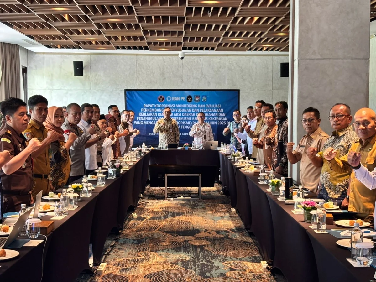 Rapat Koordinasi Monitoring dan Evaluasi RAN PE 2025–2029 yang mempertemukan pejabat pusat dan daerah dalam satu meja koordinasi. Dalam suasana formal dan penuh keseriusan, para peserta menyatukan tangan sebagai simbol komitmen bersama untuk menanggulangi ekstremisme dan terorisme serta memastikan Program Prioritas Presiden berjalan efektif di Provinsi NTB.