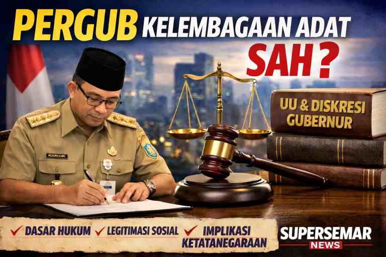 SUPERSEMAR NEWS – Wacana pembentukan kelembagaan adat melalui Peraturan Gubernur (Pergub) kembali memantik diskursus hukum tata negara. Pertanyaan mendasar muncul: apakah gubernur memiliki kewenangan konstitusional menerbitkan Pergub yang mengatur kelembagaan adat?