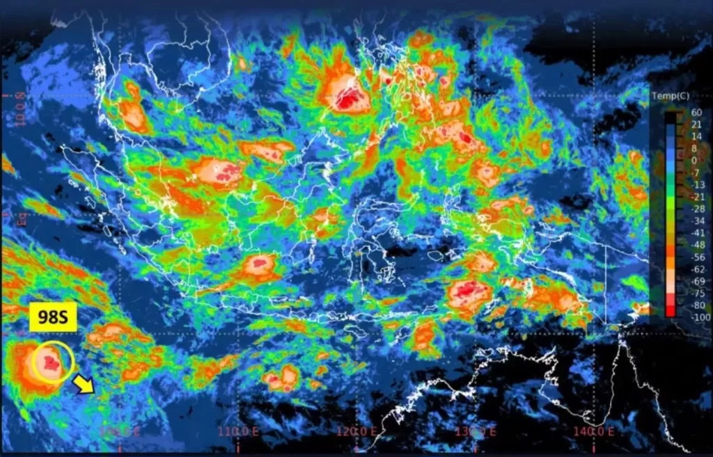 SUPERSEMARNEWS.COM BOGOR – Bibit Siklon Tropis 98S terpantau di sekitar Samudera Hindia barat daya Bengkulu, dengan kecepatan angin maksimum mencapai 30 knot (56 km/jam) dan tekanan udara minimum 1003 hPa. Kondisi ini menunjukkan potensi pertumbuhan bibit siklon tropis tersebut.