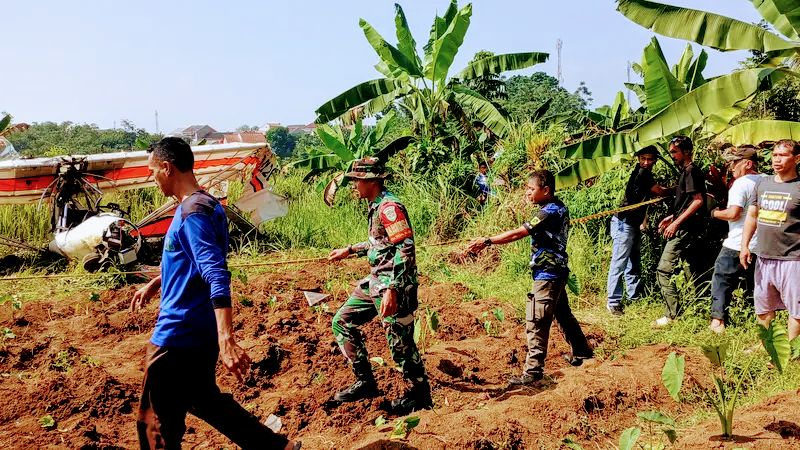 Petugas TNI dan warga mengevakuasi bangkai pesawat latih yang jatuh di sekitar TPU Astana, Ciampea, Bogor. Lokasi kejadian langsung dipasangi garis pembatas demi keamanan.