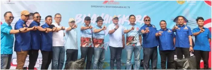 Para tokoh daerah dan jajaran Polres Bogor berpose bersama dalam rangka peringatan Hari Bhayangkara ke-79 yang diisi dengan kegiatan mancing bareng warga di Cibinong, Bogor.