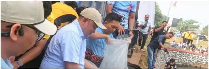 Bupati Bogor bersama jajaran Polres Bogor menebar ikan sebelum dimulainya lomba mancing bareng dalam rangka Hari Bhayangkara ke-79 di Cibinong.