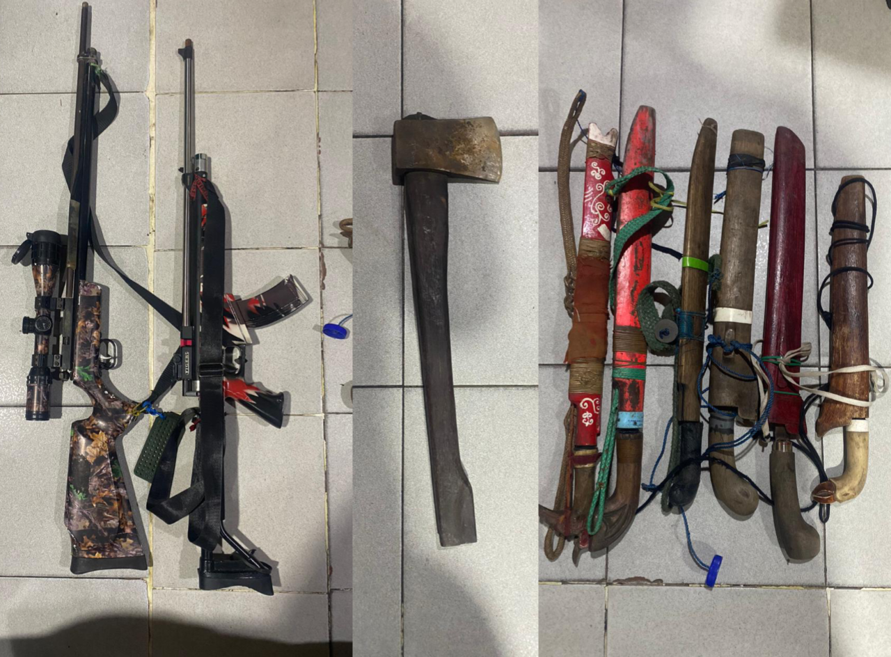 Dari hasil penyitaan di empat titik lokasi, tim penyidik menemukan berbagai barang bukti berupa pondok kayu, terpal, alat masak, alat panen sawit, serta perlengkapan tempat tinggal. Selain itu, di salah satu pondok milik EP ditemukan sejumlah senjata tajam dan senjata angin, antara lain Enam bilah parang, Satu kapak, Satu unit senapan angin PCP laras panjang merk Shamp Tiger, dan Satu unit senapan angin PCP laras panjang merk Tiger 177.