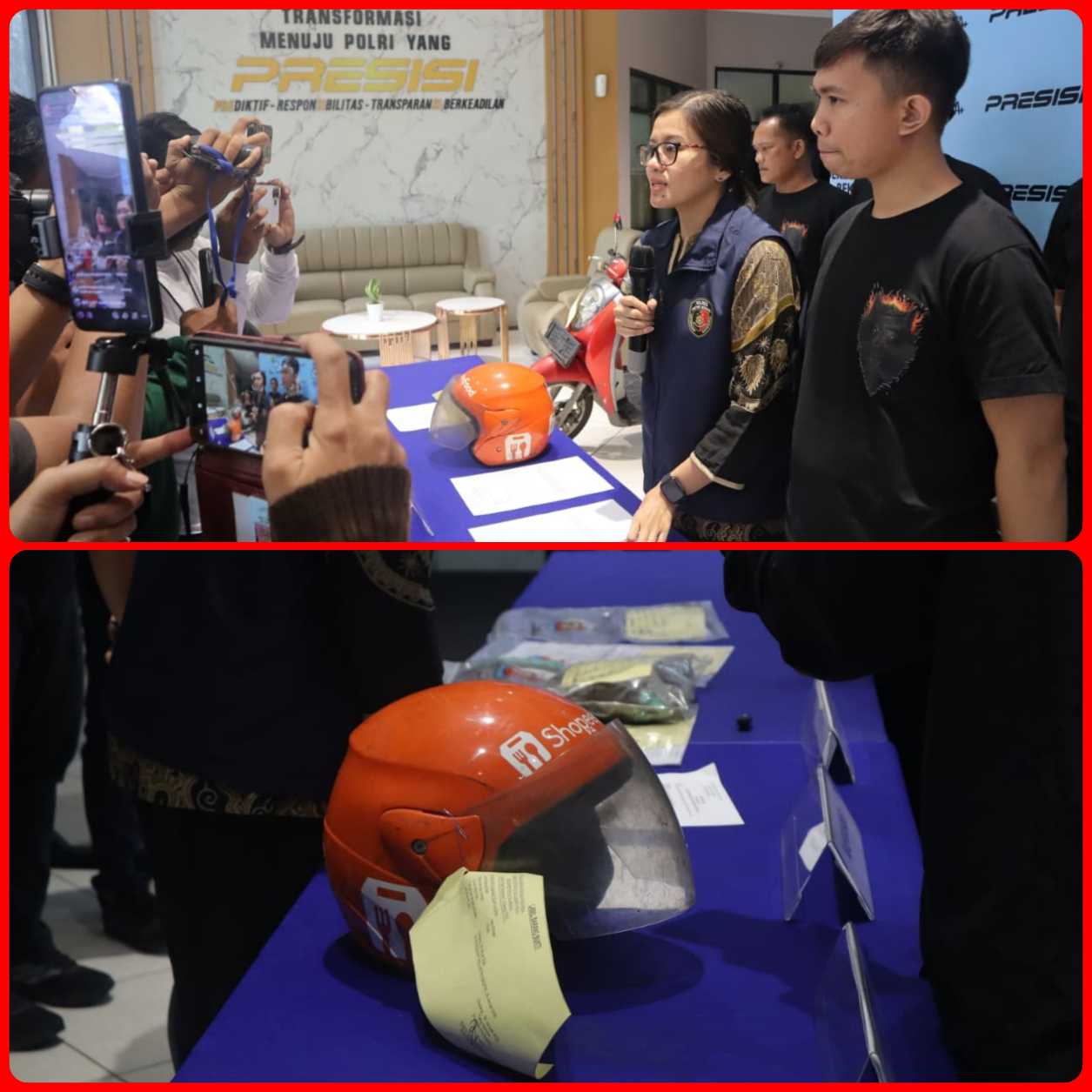 Sat Reskrim Polres Metro Bekasi memberikan keterangan kepada media dengan memperlihatkan barang bukti berupa helm ojek online dan sepeda motor yang digunakan pelaku dalam kasus penculikan anak di Tambun Selatan.