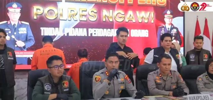 Dalam konferensi pers di Mapolres Ngawi, Wakapolres bersama jajaran memaparkan keberhasilan pengungkapan kasus peredaran uang palsu lintas provinsi. Lima tersangka ditampilkan mengenakan baju tahanan oranye, sementara latar belakang bertuliskan ‘Tindak Pidana Perdagangan Orang’ menjadi sorotan dalam penegakan hukum terpadu oleh Polres Ngawi.(foto Divisi Humas Polri)