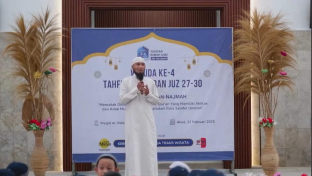 Pimpinan Rumah Quran An-Najmah, Ustadz Ma’mun Rosyid Ringgit, memberikan sambutan dalam acara Wisuda Tahfidz ke-4 di Masjid Al Hidayah, Taman Pulo Gebang, Jakarta Timur, pada Ahad, 23 Februari 2025. Dalam sambutannya, Ustadz Ma’mun mengapresiasi semangat para santri yang telah menyelesaikan hafalan Al-Qur’an hingga Juz 27-30.