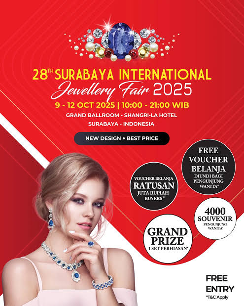 Pameran Surabaya International Jewellery Fair 2025 di Hotel Shangri-La menampilkan desain perhiasan terbaru dengan harga terbaik, disertai promo menarik dan hadiah eksklusif bagi pengunjung wanita.