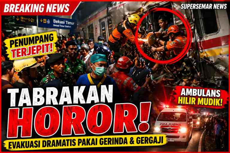 SUPERSEMAR NEWS – BEKASI — Suasana mencekam menyelimuti area Stasiun Bekasi Timur pada Senin malam (27/4), ketika petugas gabungan melakukan evakuasi dramatis terhadap penumpang yang terjepit di dalam gerbong kereta yang ringsek akibat tabrakan hebat.