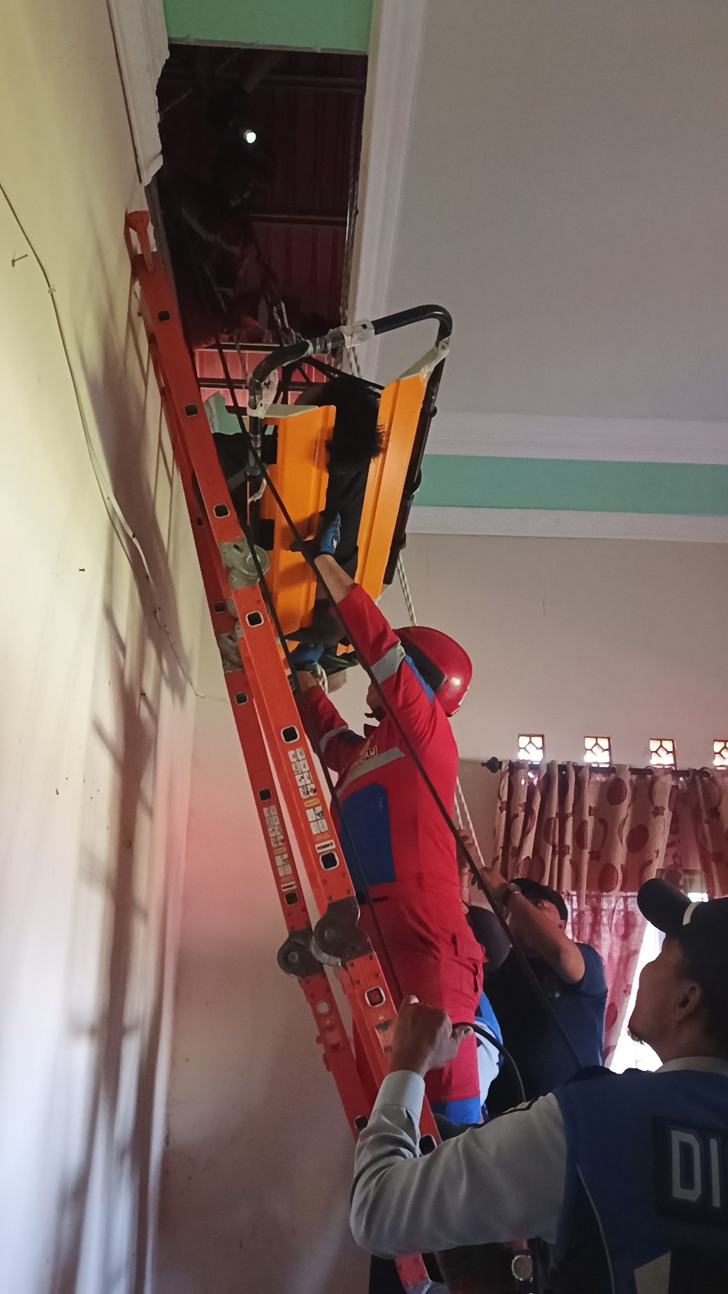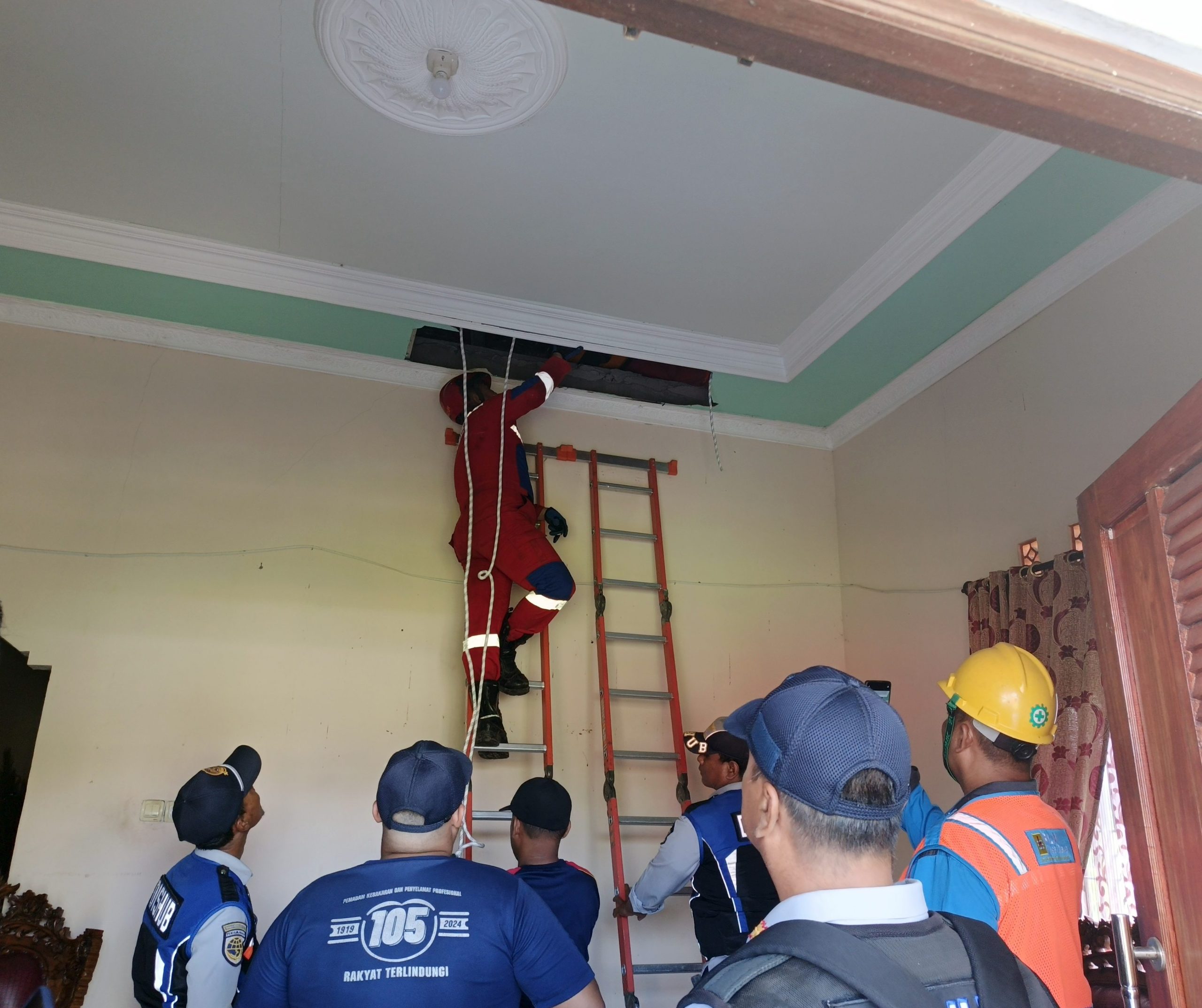 Tim gabungan dari Damkar, Satpol PP, Ambulans 112, Dishub, dan Kominfo langsung dikerahkan ke lokasi. Proses evakuasi berjalan dramatis karena korban berada di plafon sempit. Dengan menggunakan tangga, tali pengaman, dan tandu lipat, petugas mengevakuasi korban yang telah tidak sadarkan diri.