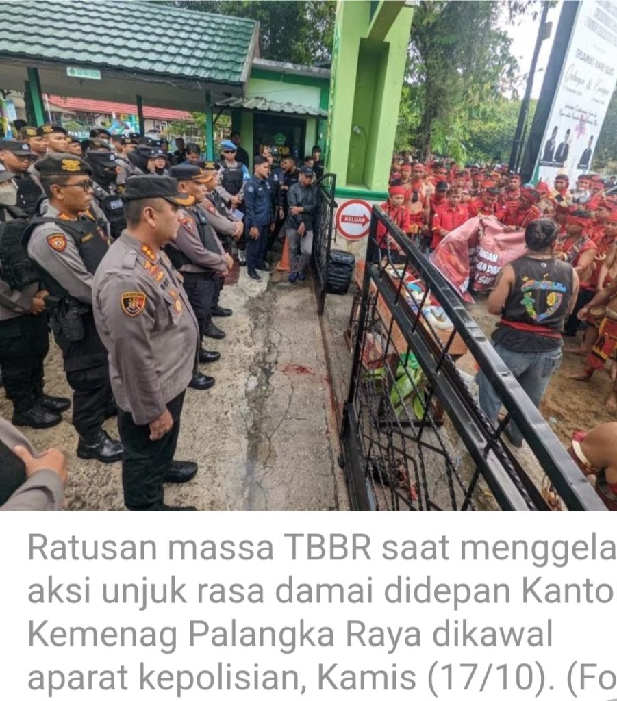 PALANGKA RAYA, Supersemar News – Ratusan massa dari Tariu Borneo Bangkule Rajaking (TBBR) menggelar aksi damai di depan Kantor Kementerian Agama (Kemenag) Kalteng, Kamis (17/10/2024).