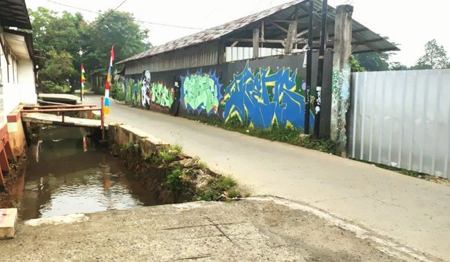Jalan Enggram di Kelurahan Sawangan Baru yang rencananya akan diperlebar menjadi 10 meter, kini masih tampak sempit dan berdampingan dengan saluran air serta bangunan warga.