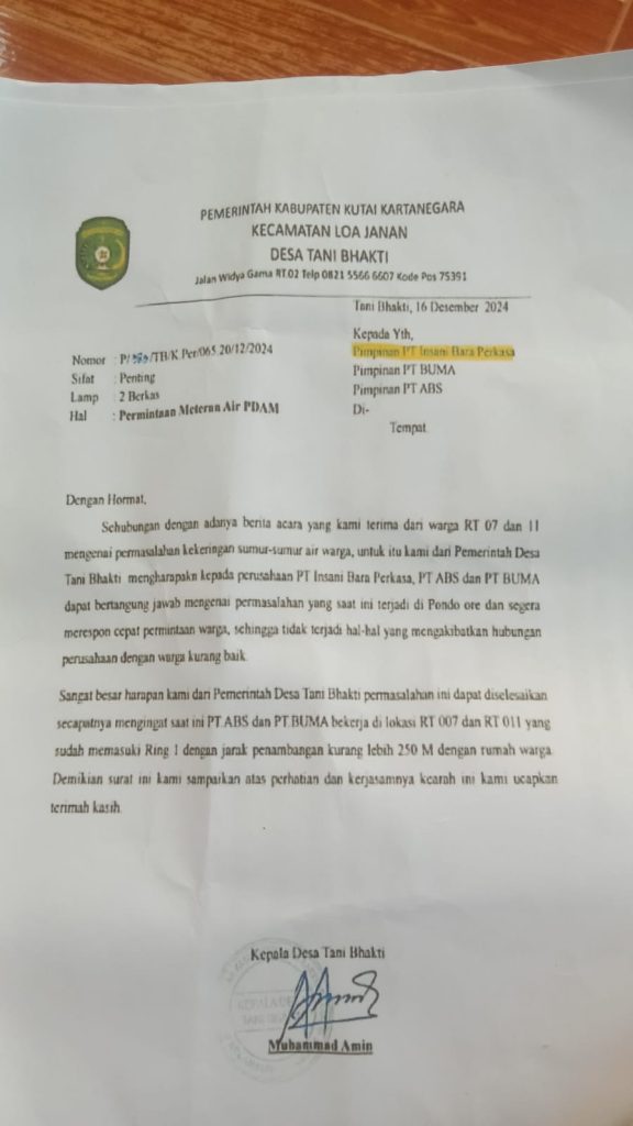 Loa Janan, Supersemar News — 12 Desember 2024 warga Desa Tani Bhakti, Kecamatan Loa Janan, Kabupaten Kutai Kartanegara, menyampaikan tuntutan serius terhadap dampak aktivitas pertambangan PT Insani Bara Perkasa (IBP). Meski perusahaan tersebut berizin resmi, aktivitasnya dinilai telah menimbulkan kerugian bagi masyarakat sekitar, terutama di RT 07 dan RT 11 Pondok Are, Km 08.